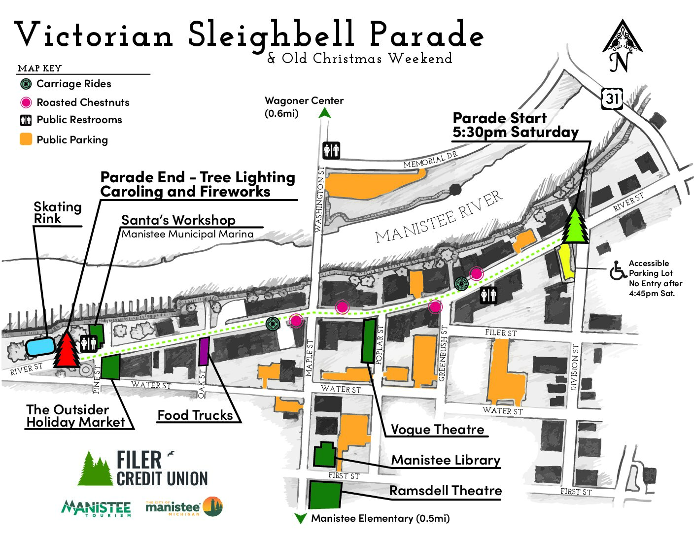 The Victorian Sleighbell Parade presented by Filer Credit Union down historic River Street is one of Michigan’s most memorable holiday traditions. This authentic parade features horse drawn carriages, turn of the century characters, 30-foot Christmas tree pulled upright by a beautiful horse team, bagpipers and much more. The parade concludes downtown’s west end near the fountain with community caroling and lighting of the tree.